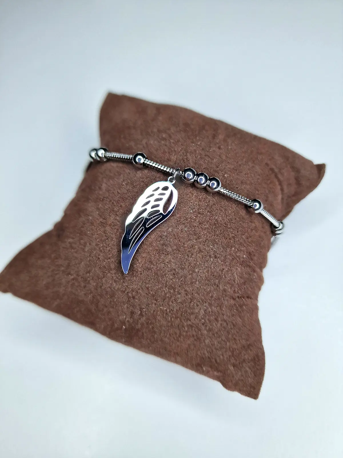 Srebrna bransoletka z koralikami z ozdobnym piórkiem doskonale skomponuje się z naszym naszyjnikiem. Dodatkowym atutem stali chirurgicznej jest to że mogą ją nosić osoby cierpiące na alergie, nie zmienia koloru, nie rdzewieje oraz jest biżuterią trwałą która ładnie podkreśla wygląd każdej kobiety. Jest w dobrej cenie i jakości.