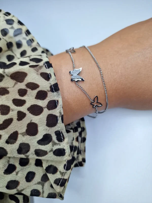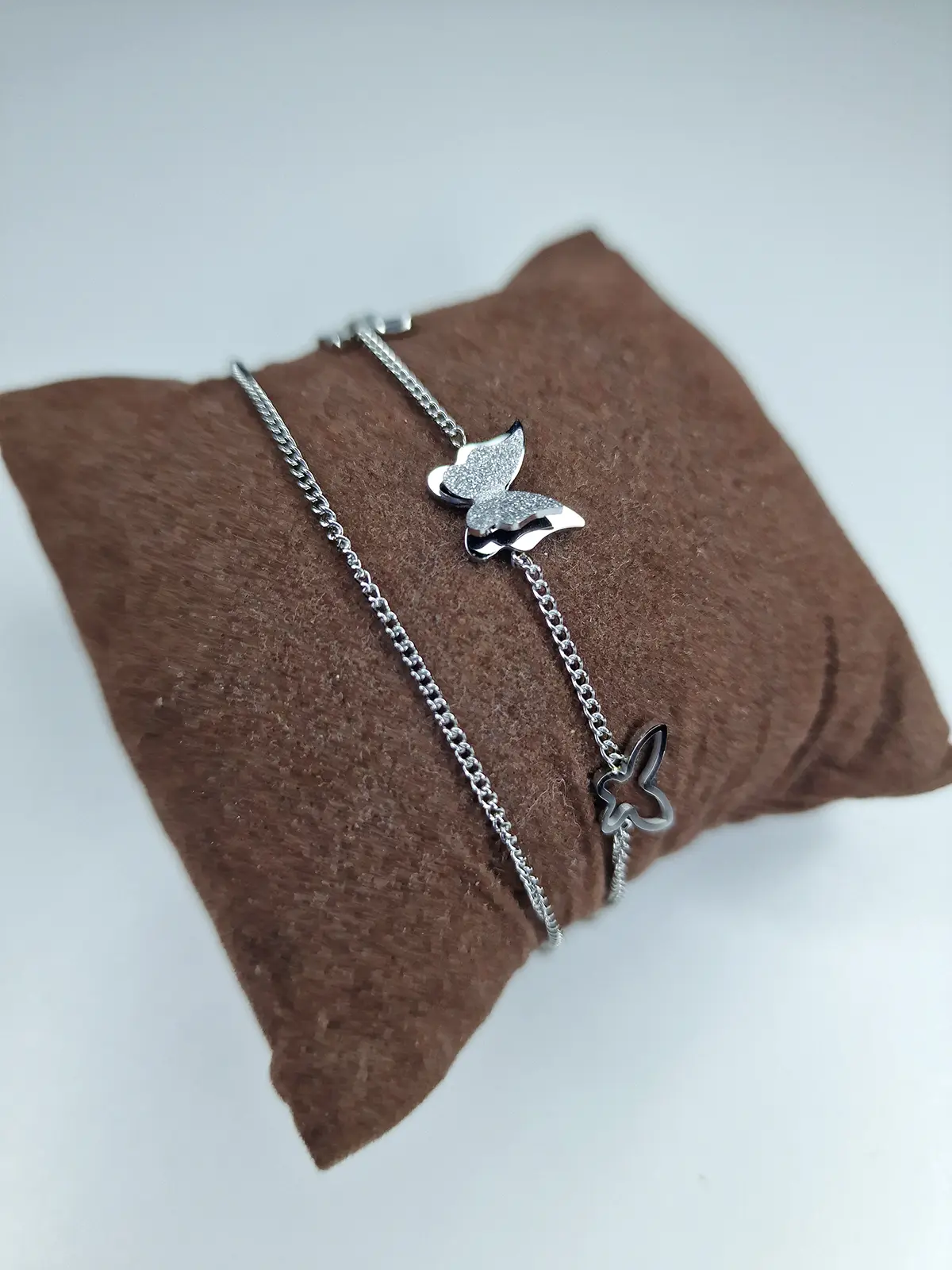 Podwójna srebrna bransoletka z motylkami stal chirurgiczna