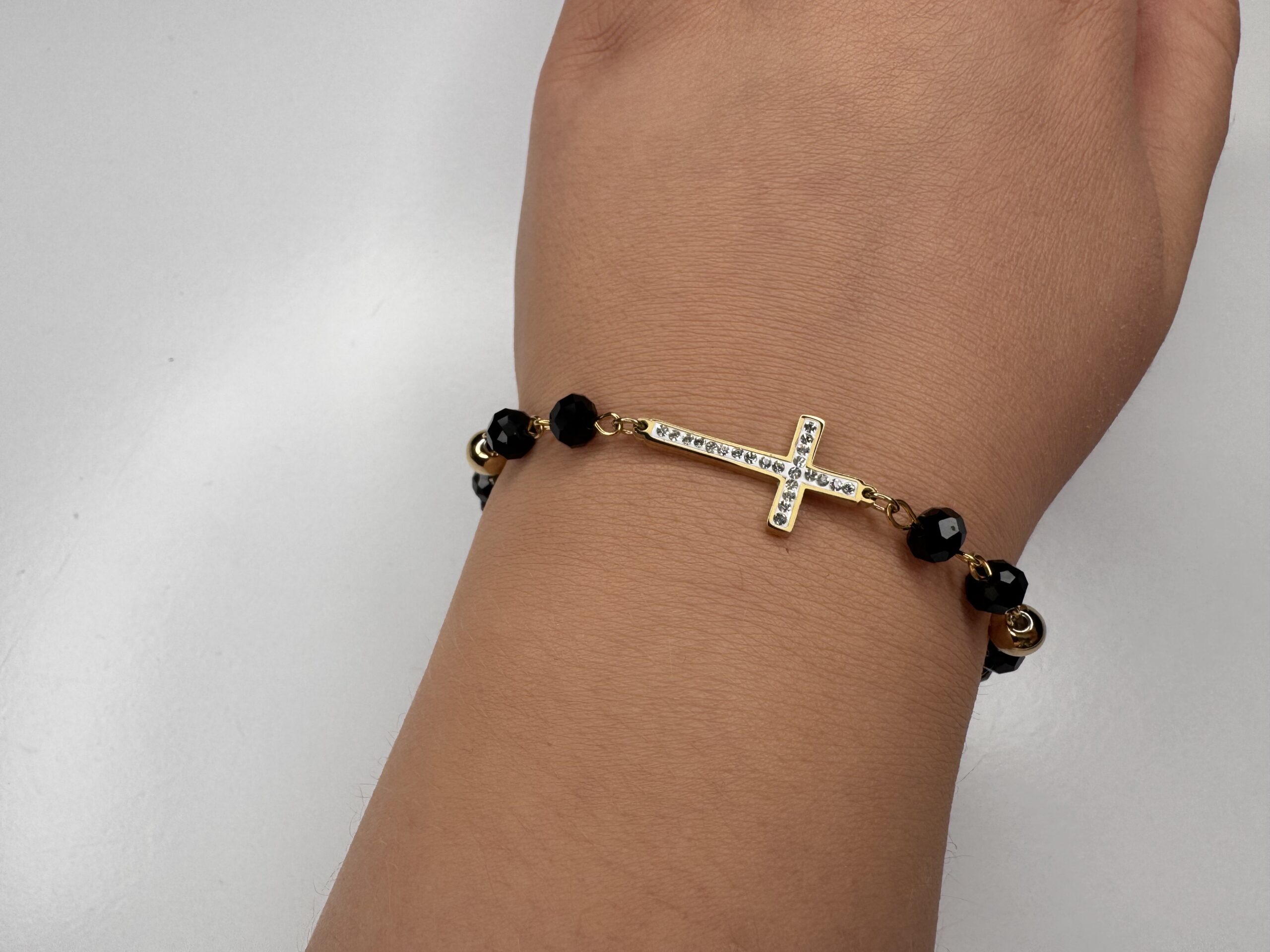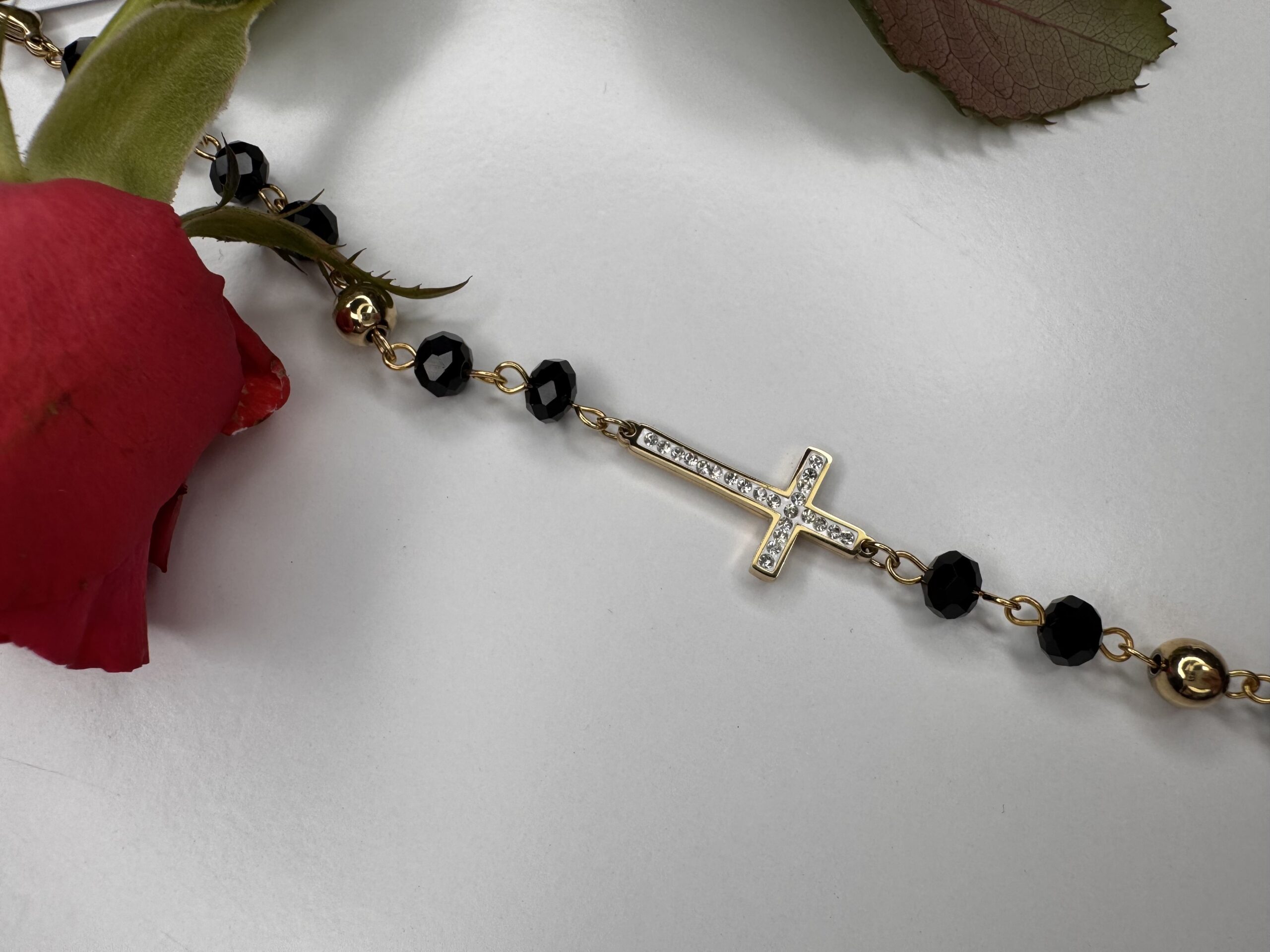 Bransoletka z ozdobnym krzyżykiem i czarnymi kuleczkami stal chirurgiczna