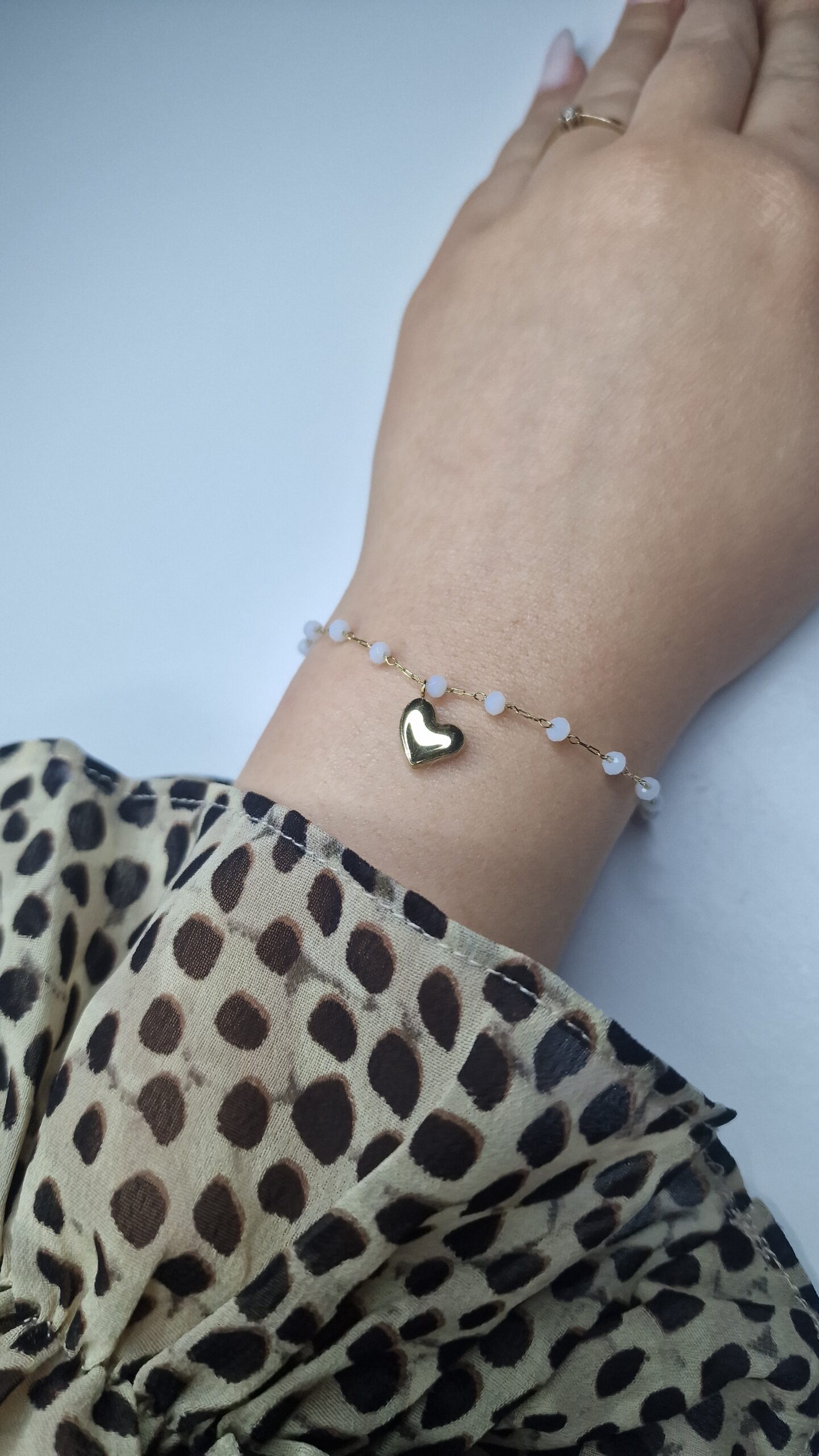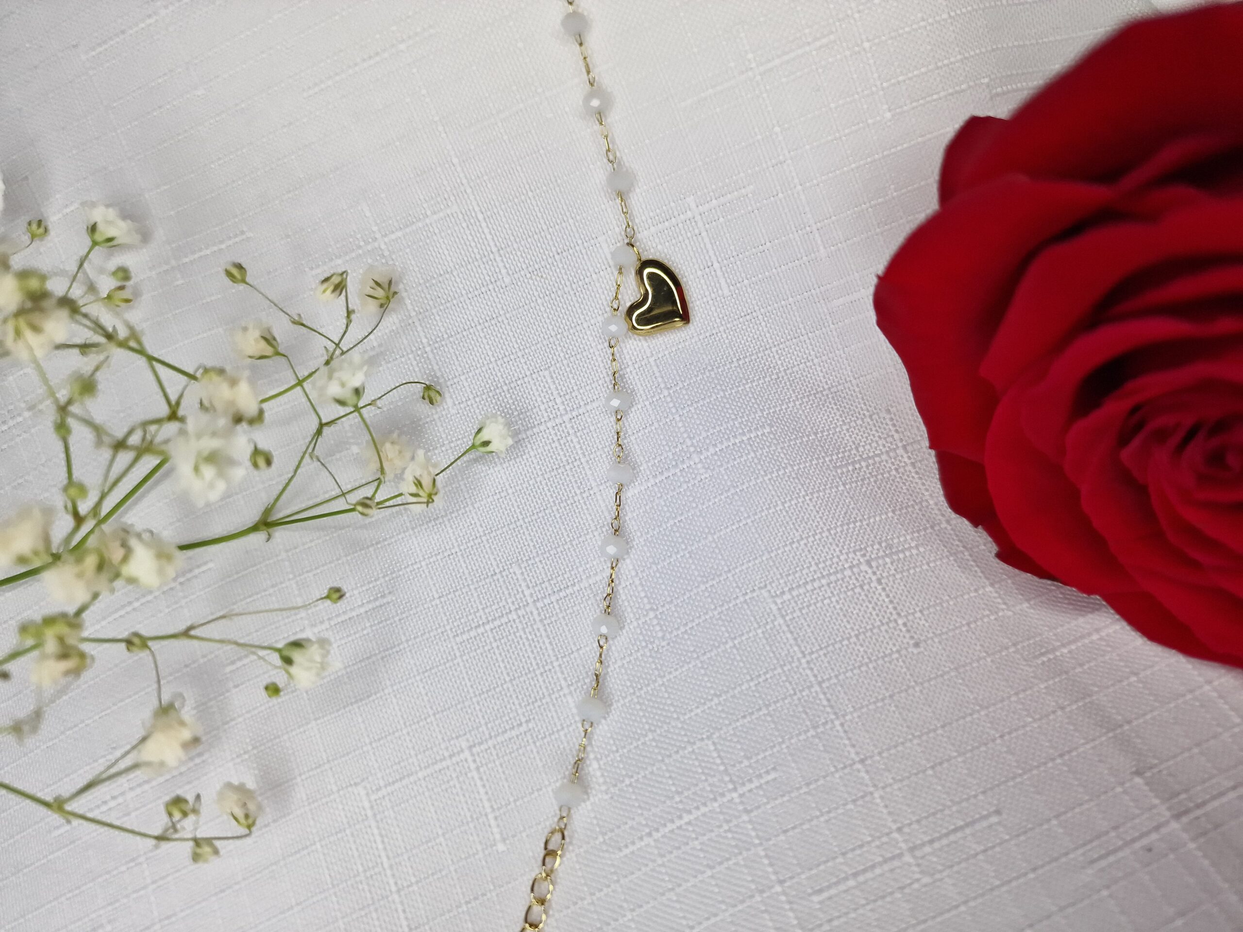 Bransoletka z białymi koralikami i zawieszką w kształcie serduszka stal chirurgiczna