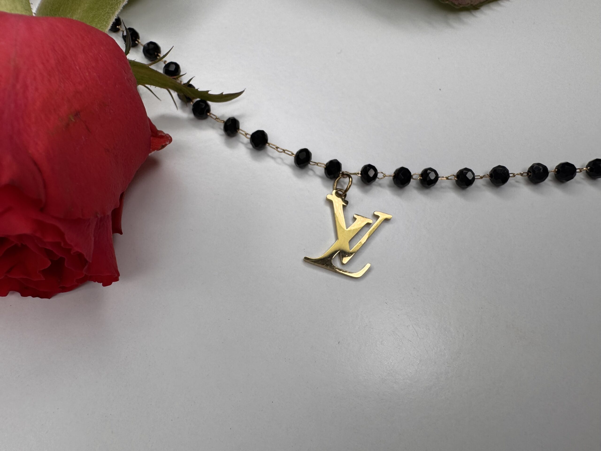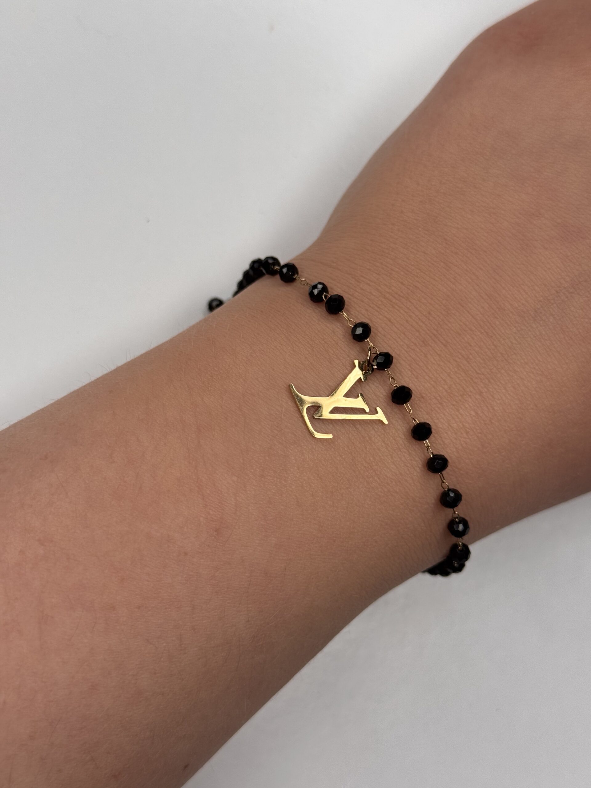 Bransoletka z czarnych koralików z literką LV – stylowy dodatek z nutą luksusu i nowoczesności.