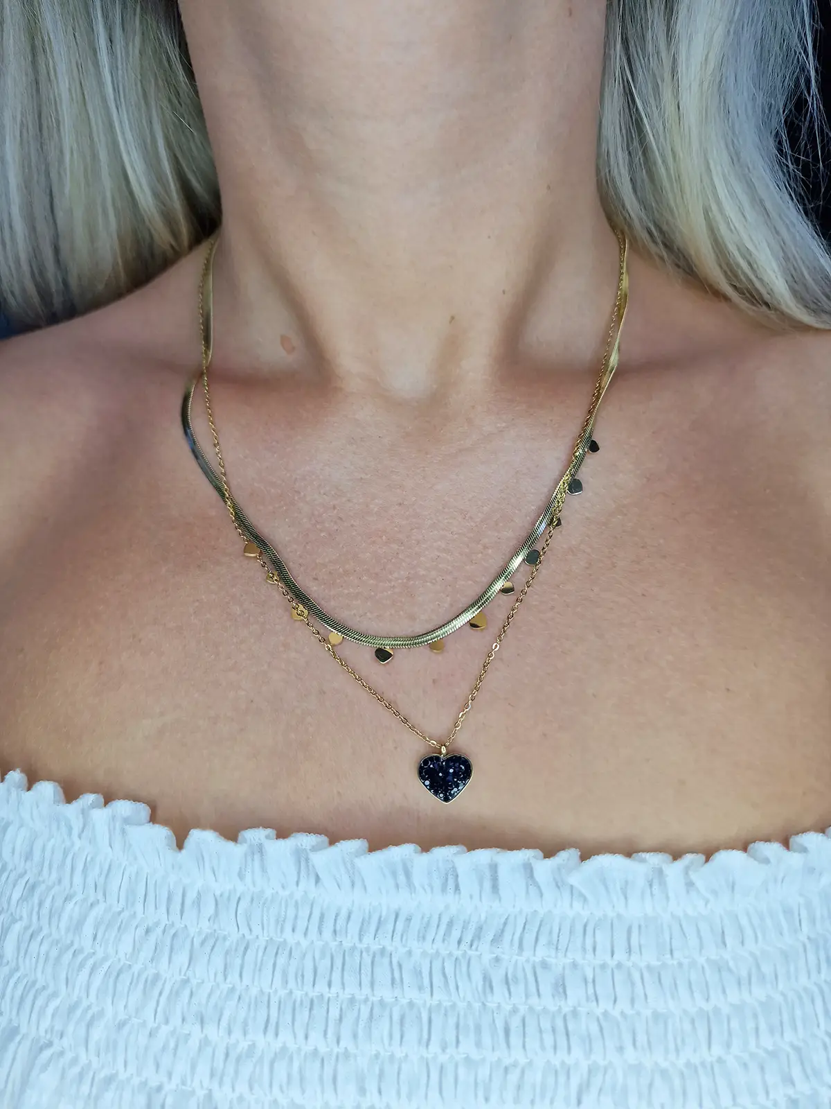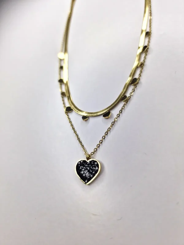 Podwójny łańcuszek z zawieszką czarne serduszko żmijka stal chirurgiczna