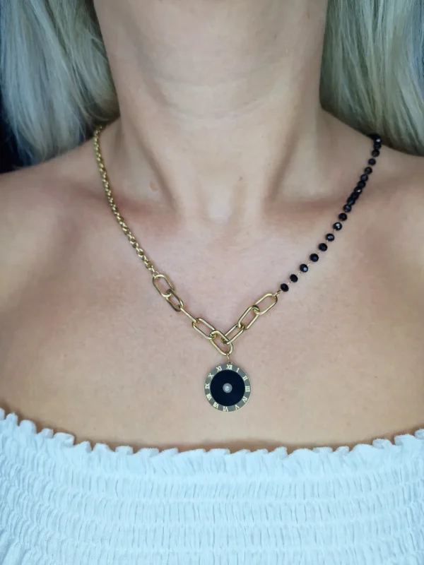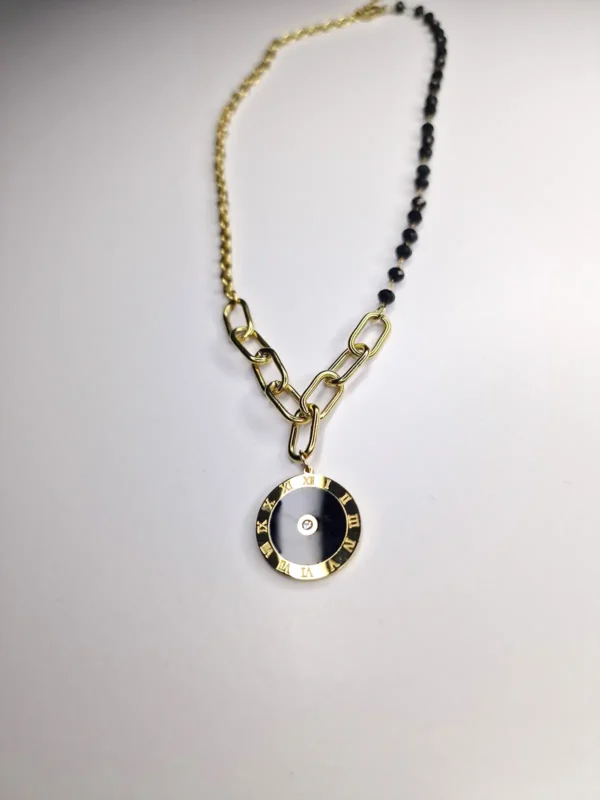 Złoty łańcuszek połączony z czarnymi koralikami z zawieszką czarnej tarczy zegara. Dodatkowym atutem stali chirurgicznej jest to że mogą ją nosić osoby cierpiące na alergie, nie zmienia koloru, nie rdzewieje oraz jest biżuterią trwałą która ładnie podkreśla wygląd każdej kobiety. Jest w dobrej cenie i jakości.
