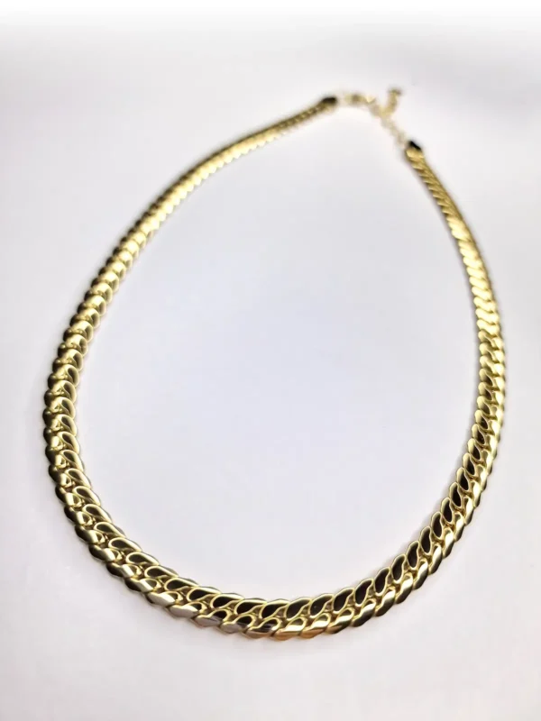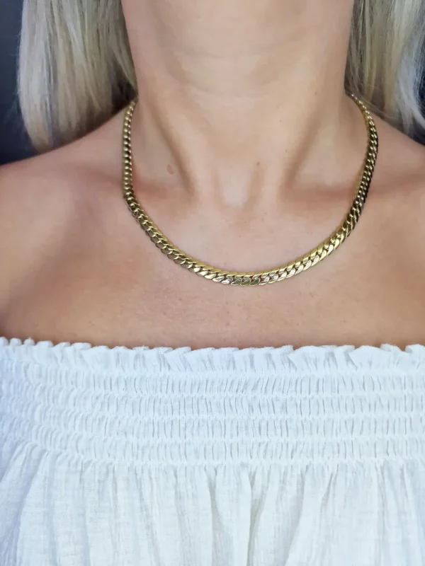 Złoty splot łańcuszka to wyrazisty dodatek dla kobiet które lubią rzucać się w oczy. Dodatkowym atutem stali chirurgicznej jest to że mogą ją nosić osoby cierpiące na alergie, nie zmienia koloru, nie rdzewieje oraz jest biżuterią trwałą która ładnie podkreśla wygląd każdej kobiety. Jest w dobrej cenie i jakości.