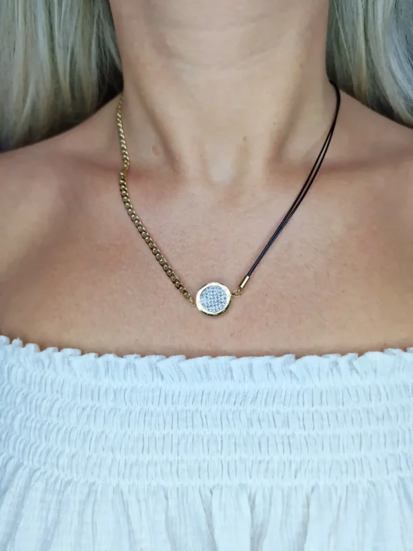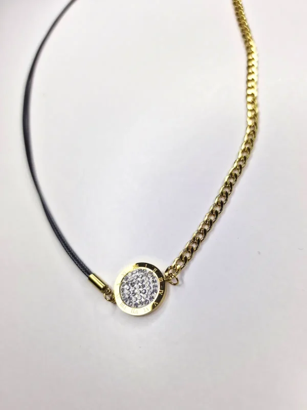 Złoto-czarny naszyjnik ze złotą ozdobą wypełnioną cyrkoniami. Dodatkowym atutem stali chirurgicznej jest to że mogą ją nosić osoby cierpiące na alergie, nie zmienia koloru, nie rdzewieje oraz jest biżuterią trwałą która ładnie podkreśla wygląd każdej kobiety. Jest w dobrej cenie i jakości.