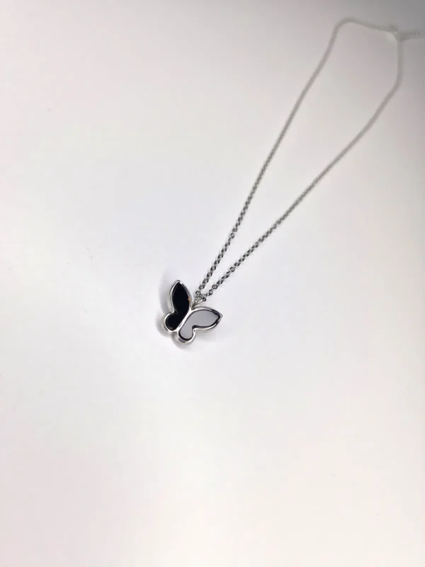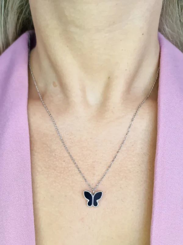Srebrny naszyjnik z ozdobną zawieszką czarnego motylka. Dodatkowym atutem stali chirurgicznej jest to że mogą ją nosić osoby cierpiące na alergie, nie zmienia koloru, nie rdzewieje oraz jest biżuterią trwałą która ładnie podkreśla wygląd każdej kobiety. Jest w dobrej cenie i jakości.