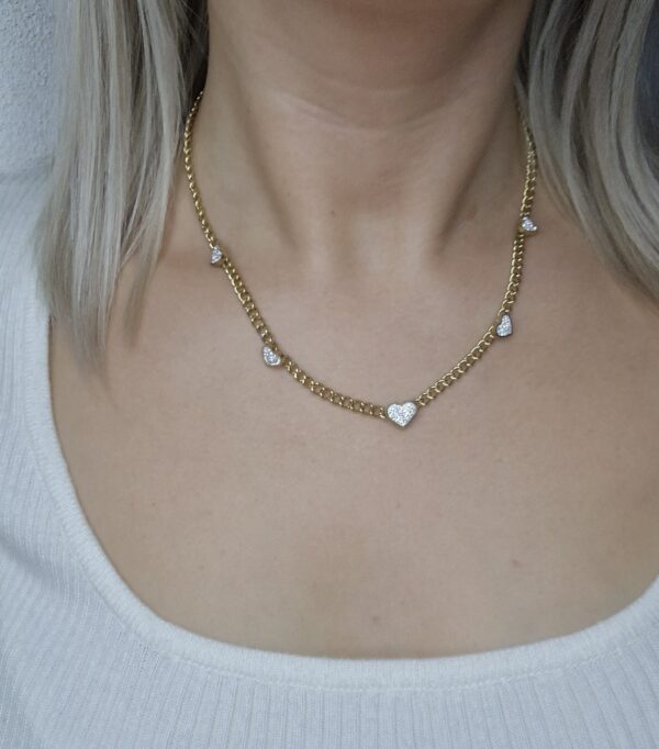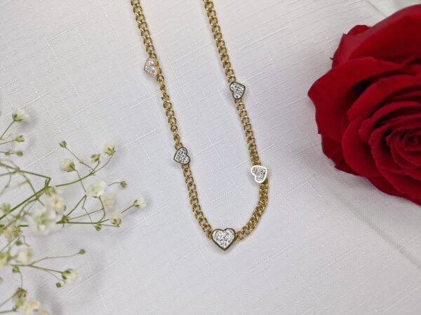 Naszyjnik ozdobiony serduszkami z wypełnionymi cyrkoniami w złotym kolorze to romantyczny i stylowy dodatek do Twojego stroju.