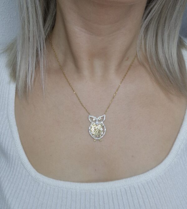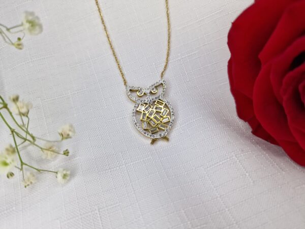 Złoty naszyjnik ze stali chirurgicznej z zawieszką w kształcie sowy, wypełnioną błyszczącymi cyrkoniami, emanuje elegancją i subtelnością. Jego unikalny design łączny wyrafinowany złoty połysk ze szczegółami sowy, dodając mu zarówno delikatności, jak i blasku. To idealny dodatek, który przyciąga uwagę.