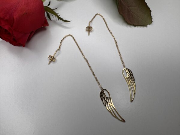 Kolczyki w kolorze złotym na łańcuszku z delikatnym motywem skrzydła. Subtelne, lekkie i zmysłowe – idealne do romantycznych i minimalistycznych stylizacji.